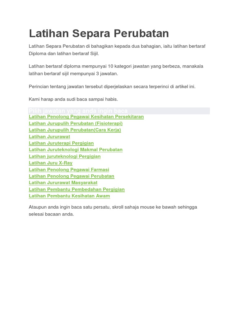 Anda akan tamat belajar selepas 2 tahun 6 bulan (5 semester). Syarat lantikan separa perubatan taraf diploma. Latihan penolong pegawai kesihatan persekitaran. Pengajian diperingkat sijil lebih singkat. Posted by rey at 5:31 pm no comments petikan dari unit promosi kesihatan bahagian kawalan penyakit berjangkit, kem.