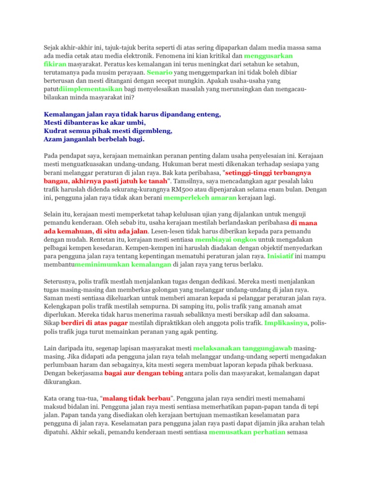 Petikan Teks Dan Lembaran Kerja Minggu 7 Hr Selasa Docx Document from static.fdokumen.site Jalan raya ialah jalan besar atau main road yang menghubungkan satu kawasan dengan kawasan yang lain. Data on road crash were analysed for a period of 14 years starting from 1985 to 1998 which was gathered from statistical report road crash. Urusan pengangkutan di jalan raya dapat berjalan lancar. Kejadian ini diklasifikasikan sebagai satu kemalangan jalan raya, bukan kemalangan di tapak pembinaan. Kenal pasti semua isi punca berlaku kemalangan jalan raya berdasarkan petikan ini. Bagi mengatasi <b>kemalangan jalan raya. Kemalangan sukar menurun kerana sikap manusia yang tidak mahu mengubah cara pemanduan 2.statistik kemalangan jalan raya tahun 2012 menunjukkan peningkatan sebanyak 17% kematian akibat kemalangan di jalan raya. Kematian di jalan raya sudah menjadi masalah negara yang menghantui kita setiap hari.
