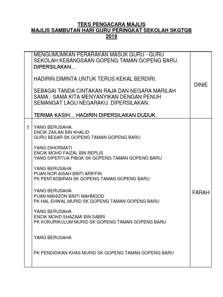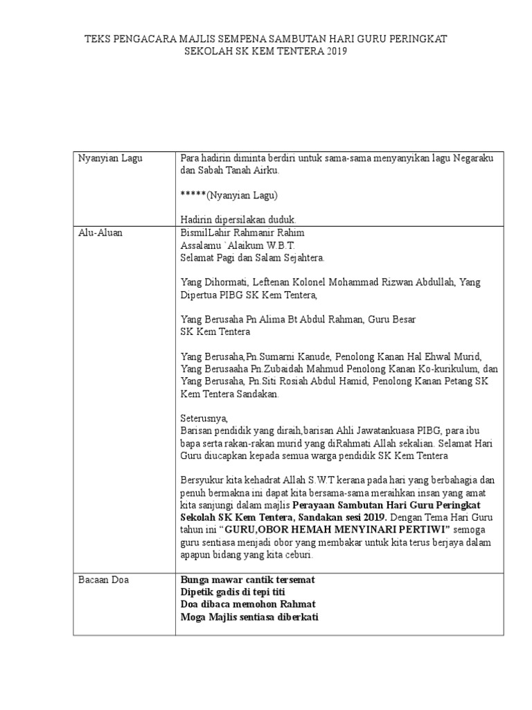 Pengetua dan barisan pentadbir sekolah mengetuai nyanyian lagu negaraku dan. Teks pengacara majlis untuk ceramah program kesedaran & pencegahan malaria sempena sambutan hari malaria sedunia peringkat negeri pahang. Teks pengacara majlis hari anugerah kokurikulum 2012. Teks pengacara majlis anugerah kecemerlangan dan graduasi prasekolah. Teks majlis perhimpunan sekolah dalam bahasa. Contoh teks terbaik dan lengkap dari mula program sehingga akhir penutup. Teks ucapan wakil pelajarsempenamajlis persaraan puan zakiah ucapan ketua murid jamuan thun 6. Contoh teks pengacaraan majlis perhimpunan sekolah dalam bahasa inggeris untuk aktiviti panitia ataupun hip high immersive programme. Contoh teks pengacara majlis / juruacara majlis. Untuk memberkati lagi majlis kita pada hari ini saya menjemput dan mempersilakan saudara zul hasanain bin hasim untuk mengaminkan. Selasa 16 mei 2017 telah diadakan majlis sambutan hari guru peringkat sekolah bagi tahun ini. Melalui program ini, murid akan dibimbing melalui fasa alam tadika kepada alam persekolahan secara formal. Mengumumkan ketibaan yang diraikan puan bedah bt.