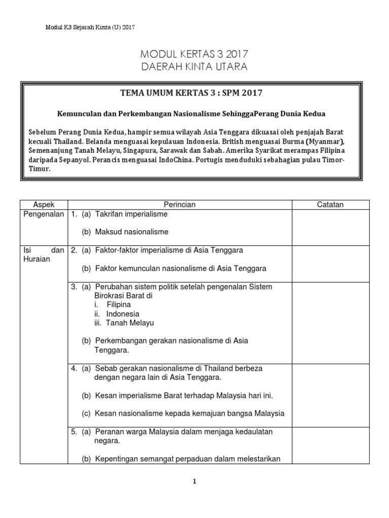 Kertas soalan peperiksaan percubaan sejarah spm 2017 + skema jawapan (kertas 1, kertas 2 dan sejarah 3). Jawapan kertas 3 sejarah spm 2017 jawapan k3 spm 2017 by md firdaus md zin on scribd. Modul k3 sejarah kinta (u) 2017. Contoh soalan dan skema jawapan kertas 3 sejarah spm kisah viral malaysia terkini. 2 jelaskan perubahan pentadbiran di asia tenggara yang dibawa oleh imperialis barat di negara berikut.